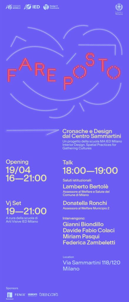 Un dialogo generativo tra creatività e responsabilità sociale, in collaborazione con il Comune di Milano e gli operatori del Centro Sammartini che – attraverso micro-interventi progettuali a basso impatto trasformativo, arredi specifici per le attività del centro e dispositivi flessibili e mobili per cittadini e operatori – restituisce visibilità e appartenenza a chi vive ai margini, creando “luoghi” riconoscibili e caratterizzati da funzionalità e bellezza.
