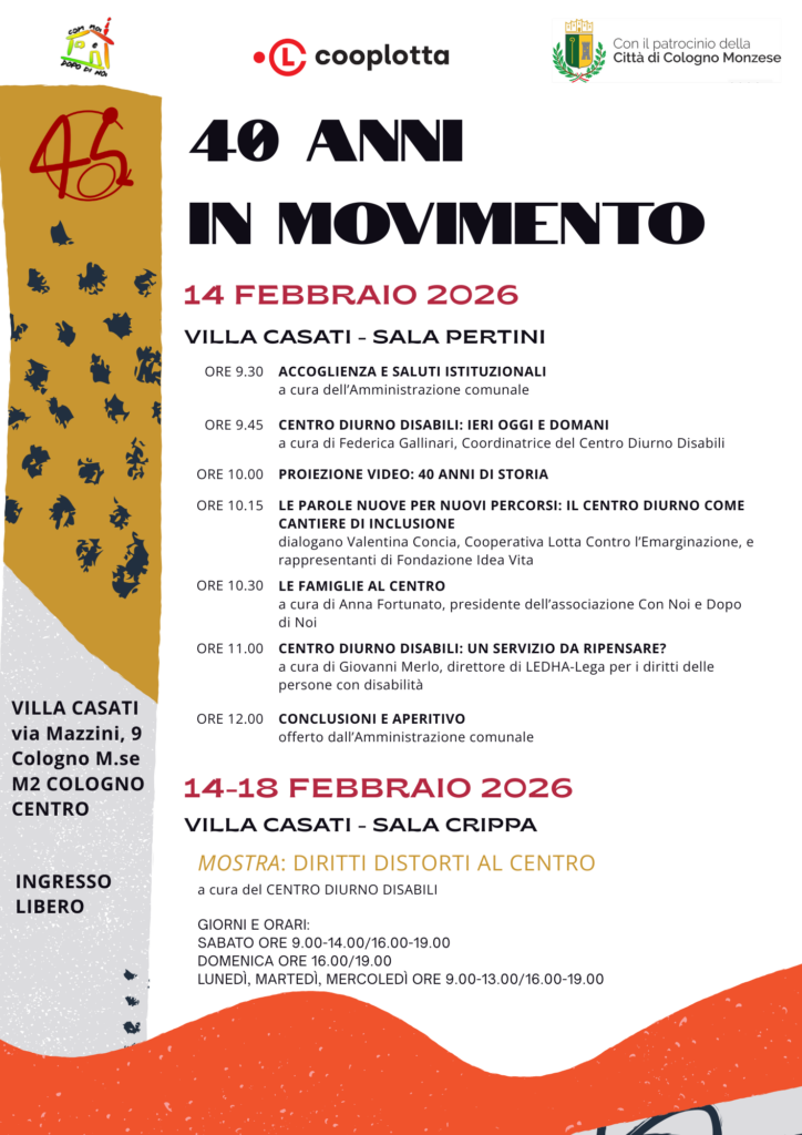 Sabato 14 febbraio 2026, Villa Casati ospiterà un’importante giornata celebrativa dedicata ai 40 anni di attività del Centro Diurno Disabili di Cologno Monzese, organizzata in collaborazione con l’associazione Con Noi e Dopo di Noi.